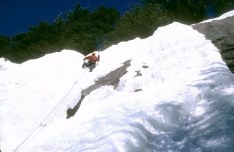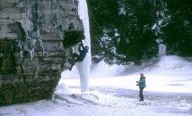 Luke Laeser and I wandered through the canyon, awestruck by the thick, blue, healthy looking waterfalls, frozen like cut crystal candlesticks to the tawny shale. Luke climbed a steep column of ice, then we proceeded to toprope (a type of climbing in which a safety rope is rigged above the climber) about fifteen different variations to the pillar and the rock wall next to it. We had found heaven. And, looking around, we guessed it would have taken us a month of climbing every day just to get acquainted with Pont Rouge.