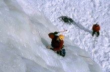 As Québec shrugged off the cold snap (the daytime temperatures rose to a very comfortable -5º C), we spent a day at the chute, climbing ice walls varying from 75 degrees to 90. A couple from Poland climbed next to us; they had read of Québec’s wonderful ice and had flown over for a winter ice-climbing holiday. Next to them, one of the local “technical” policemen (trained in special rescue techniques) climbed the chute with his son. Tourists wandered up every few minutes, fascinated by the falls and the popularity of climbing them. When lunch rolled around, everyone pulled out warm baguettes and thermoses of coffee-it was very civilized ice climbing. You know that when you smell fresh baked bread and steaming hot coffee that a mountain sport has evolved.
