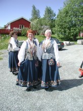 After passing many churches and looking for just the right one to photograph (they all look exactly alike but we couldn’t find a safe turnout on the narrow 2 lane main highway with almost no shoulders and very curvy), we finally found one just outside Trondheim as we drove along the Trondheimfjord. We turned in to take a photo and I spotted a gathering of people with some women in traditional costume. I got nerve enough to see if I could photograph them and they were thrilled. The costumes show where they live and most women make their own. The sisters dressed alike and had costumes made by their mother. It was a family gathering for a confirmation of a young boy, and guests and extended family were there even from US and thought I was family too, but I was in jeans and looked very out of place, but they made me feel very welcome and spoke good English. I photographed them and inspected their beautiful dresses with fine hand embroidery and met the mother who had made them and so wish I had taken her epic too. I then gave them my card about RTADV and they were so, so excited. It was really fun!