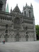 At the completion of the bus tour, we found that a short walk would bring us to the gothic style Nidaros Cathedral which was started in 1070, taking 200 years to complete. Orginally the city of Trondheim was named Nidaros and was the first capital and only religious center of Norway, thus the name of the Cathedral. The city was founded by Olav I in 997. After his death in AD 1000, Dannish kings ruled until Olav II took over as King in 1015. King Olav II became a Christian and then forced everyone else to convert by choice or by sword. The statue of him in the center of a huge cobblestone sundial of black and white bricks shows him stepping on the animal and holding his sword over the beast of heathenism. He was made Saint after his death and the cathedral was built over his grave.