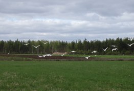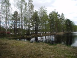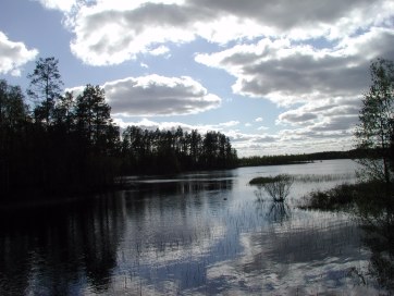 We had checked out the directions to the nearby Salamajarvi National Forest. We drove and drove and drove, nearly 90 km before we realized the little sign we first saw, which we ignored (thinking there would be a big sign telling us where to turn,) was the actual turn sign. So we went 270 degrees around the circular route too far, but we finally found the park and stopped to hike on the boardwalk through the bog. Bog seems to be old moss that is decayed by the snow and compacted through the years to be like a huge, black sponge, with new green moss on top. The water from snowmelt is black all around like a sort of swamp, hence the Park Service makes boardwalks. The forest was pretty, of rather spindley pines, spruce, and birch, the only kinds of trees we’ve seen. We saw some unusual birds and hiked about a mile to a big lake and a little farther our boardwalk ended at a swamp we couldn’t cross. The boardwalk was a bit teetery and gave us a bit of an unwanted thrill at times when the big wood pegs, which held the flat hewn boards to the round cross beam logs, had given way, and we nearly fell into the soggy bog. In a dry place Bonnie tried stepping into it and sank way down….like sinking in very deep snow….very interesting and so soft!