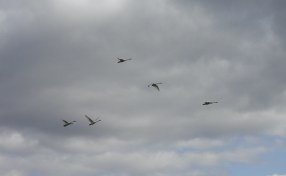 We passed a green field and saw a large flock of the rare, wild, white swans we had read about. One of our group hiked across the field to photograph them and the others watched a farmer glare at her bold and annoying intrusion, but she never saw him. She had on a white running suit and was hoping the swans would think she was a giant swan, but they scared into flight as she got close. But we had been privileged to see one of Nature’s rare and wonderful species.