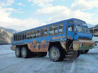 After breakfast on the train, we discover that Jasper is a city in the heart of a National Park. There are hiking opportunities everywhere, starting in the center of town and heading out over the hills and into the woods. But first, we’re headed up to the Athabasca Glacier, part of the 130 square mile Columbia Icefield. We arrive at the Glacier and board the enormous Snowcoaches designed specifically for glacier travel. There’s an old half-track snowcoach sitting there as a reminder of days long past. The new coaches have large tires, large picture windows (all the better to see when we drop over the precipitous edge of the ridge down onto the glacier) and powerful engines to make the descent and ascent to and from the glacier. Once on the glacier, we get out and are free to walk and explore, however, with the warning to stay on the graded area and away from the crevasses.