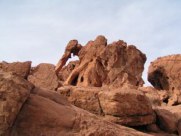 Between Las Vegas and the Northern shore of Lake Mead stretches a most spectacular and awe-inspiring expanse of rugged gray sandstone mountains and rich red, carved rock mounds, which form a popular hiking and picnicking State Park called the Valley of Fire, which attracts about 200,000 visitors a year. This was created as the first of Nevada’s State Parks and 8,760 acres were dedicated in 1934. The tallest mountains of the range are the oldest, and in Paleolithic times, before the dinosaurs, these peaks were the bottom of an ancient sea, now long gone. Shells and fossils reveal their story to geologists. The shorter and more prominently-fascinating red columns and huge rock piles are younger, from the Mesozoic Period when dinosaurs roamed. These intriguing wind-carved columns and balancing rock boulders have funny faces and wierd shapes.