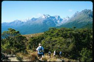 Next morning found all six of us rested, standing in tall grass spiked with purple foxglove beside the Travers River. Kyle pointed to the slate gray, snow-streaked peaks in the distance and said “That is where were we will sleep tonight.” The under-thirties sprang like jackrabbits up the trail and were soon out of sight. I followed behind Lutz, a fit 64 year old Californian, whose stocky body was dwarfed by his pack. He picked his way through the root-strewn trail that led us through the towering red and silver beech forest. Three-quarters of the amazing variety of plants growing in this preserve are endemic.