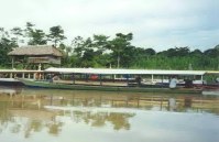 The 35 horsepower, outboard motor whirred reluctantly, and we were off on our four-hour journey upriver. The boatman explained that the river had already risen forty feet in the last week, beginning its swells because the rainy season had begun upriver. This would slow our progress against its swirling, brown currents. For about an hour we puttered along, staying too far away from shoreline to suit me because I’m not a strong swimmer and there were no life jackets aboard. We stopped to pick up several local passengers and part of our food supply for the Resort. Eight open, cardboard flats, each containing three dozen eggs, were stacked on top of each other in front of our young, bronze “captain,” who was dressed in khaki shorts, a torn tee-shirt, and thongs. (At several points along the journey he hopped over the eggs to reach a tool as we held our breaths.) While the motor sputtered quite reluctantly in restarting, we were zipped down-river with the current at lightning speed.