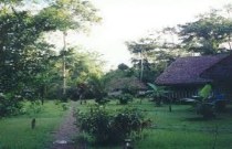 We had to make two more stops for locals to get on or off at “nowhere” in the middle of the jungle, and we passed a few cane huts here and there, but Juan wisely never stopped the motor again. Finally about six o’clock, he announced that we had reached our destination, and he docked at another wooden post. Two friendly men in khaki shorts and thongs greeted us and held our hands as we disembarked precariously onto the mud bank, each of us carrying his own luggage. As I looked up the forty-foot high river bank, into which mud steps had been machete cut, I was thankful that we had wisely been advised to leave our big suitcase at the airport and take only a small bag of necessities. We trudged up the steep embankment, relieved that our luxurious Resort was awaiting us above.