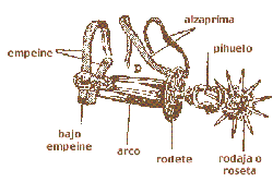 -The grip, with its “boquilla” (opening) is the part where the weapon is introduced to put it away. The “boquilla” has in its upper border a triangular fitting that is used to keep the sheath fixed to one’s waist, so that the sheath does not slip. This fitting is called “agarradera” (grip) or “gancho” (hook).