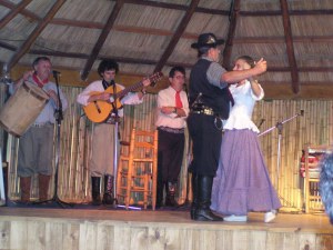 We were treated to the old style of Argentine gaucho music and to see many of the original dances performed by a young china in loose white overblouse and full print skirt with ruffle. Her partner was a very talented gaucho dressed in black with a fancy belt and a menacing knife at the back of his waist. He wore his pants tucked into his knee-high, soft leather, black boots. They performed many of the old gaucho dances: samba, gato, chucarreira, escantido… flirtatious dances mostly performed with partners going apart and back toward each other, but only touching hands occasionally.