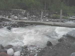 Weather is a big factor in how much you’ll see when visiting Mt. Rainier. One year we had longed for months to return to the mountain and had driven with eager anticipation for several days, only to arrive in thick fog and rain. We made camp at Cougar Rock, which has lovely level camping sites with picnic tables and firepits. However there are warnings about Lahars, mud and rock slides, and earthquakes…not a campground for the fearful! As we huddled under umbrellas at the campfire program that night the Ranger told us that the Park Service had thought of closing this campground because of potential dangers, but so many visitors had protested they decided not to. However, if you ever hear the roar of a train you run as fast as you can for high ground. This campsite is so beautiful, beside the roaring rapids of the milky, glacial-melt, Nasqually River it always seems to us to be worth the remote risk. After all, we want our ashes to be scattered here anyway!!