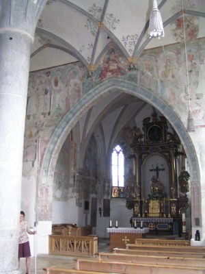 In historic times these scenes were painted on fresh, wet plaster to show the neighbors how wealthy the owner was, each out-doing the other. Scenes might be religious, or show what kind of shop is within, or show a scenic picture of the times. About every 50 years these must be restored, and only a few artists are skilled enough to do this. However, children are now taught to treasure ancient traditions and to learn the skills required to carry them on. Throughout Bavaria traditional festive clothing is still used regularly for a meaningful event, and always for church, which the folk attend faithfully at least once a week. This area, which was not affected by Luther’s rebellion, is mostly Catholic. On our walking tour of in Garmisch we saw the oldest Protestant church of the area, with its fading frescos and simple interior, and the contrasting grand St. Martin’s Cathedral, with its lovely pink marble interior and ceiling frescoes. Along the strasse we saw the oldest houses, handed down from generation to generation within one family, and this inheritance forced people to marry close relatives sometimes just to keep the property.