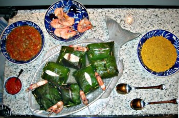 Open the banana leaves and serve with the remaining tomato sauce, farofa, and Malagueta sauce on the side. (Serves 6)