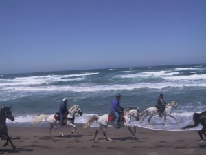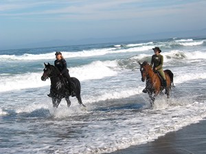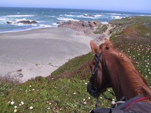 “These horses really are incredibly fit,” came from the girl’s mother, a veterinarian from Davis, as we trotted up to a ridge trail no more than 30 feet wide with vistas on either side. To the right velvet green forested slopes. To the left, the shimmering blue sea with a ten-mile strand of sand that would be our destination in the morning.