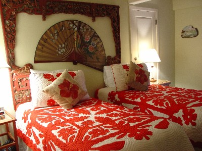 The Old Wailuku Inn is truly an experience – Hawaiian ambience, comfortable main rooms, an open-air front porch that overlooks tropical gardens. Owners of the inn are Hawaiian-born Janice and Tom Fairbanks, gracious hosts. We chose a garden room, the Hibiscus Room, with private patio because it was the least expensive and sounded secluded. Its beds are covered with gorgeous Hawaiian quilts, wood and wicker furniture and a patio full of flowers. Janice’s gourmet breakfasts are the best – sausages and malasadas on Sundays!