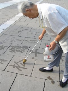 On my last day I decided to have a meaningless little chore. I like to do that sometimes, just to see where one might end up. This days goal was to find those white doughy buns stuffed with sweet red beans. I had had them in Japan and loved them and heard that they also eat them in China. So first I tried just looking for myself at different bakeries. When that didn’t work I tried explaining what I was looking for to various people. But as you can imagine, gesturing buns filled with something could be interpreted as a very different thing. Finally I found someone who spoke a bit of English and wrote out the word for me “do sha bao”. I proudly returned to all my previous folk and showed them my wee bit of paper so they wouldn’t think I was absolutely insane which may have convinced them that I was. Anyway, I found the buns and the lady even warmed one up for me. While I was gloating and moaning (even though I must admit I had been experiencing euphoric recall yet again, and it really wasn’t as tasty as in my memory), I was approached by yet another young girl wanting to “practice English”. I really was in no mood; tired, grumpy and just wanting to be left alone. But somehow she convinced me to come see her schools display of calligraphy. I thought it would be obvious by my ripped up shorts, dingy stretched out T-shirt, something the cat coughed up hair and otherwise total lack of class… that I would not be purchasing any artwork today… but no, she just didn’t get it. I waved good-bye and decided to hide out in my room and try to make sense of Chinese TV. I was actually able to follow some of the soap operas which just convinced me it was time to go home.