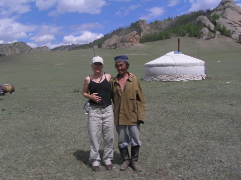 Then, back to the jeep. Now, I can’t say as the jeep is much less bouncy than the horse. There are few paved roads in Mongolia, mostly dirt tracks zig-zagging around vast open spaces. I have no idea how the drivers know where they are going. I don’t think they do, really, they just head off in a direction and eventually get somewhere. But bouncy just doesn’t describe it; we are talking hours of huge pot-hole, rock, river-rutted, spine wrenching, teeth jarring, whip-lashing, flip-flopping around the back, hang on for your life, packs on your head, whoop-it-up-you-might-be-dead-any-minute kind of bouncing. Mostly it was a lot of fun, and, amazingly enough, eventually I could even sleep through it. That’s pure exhaustion?