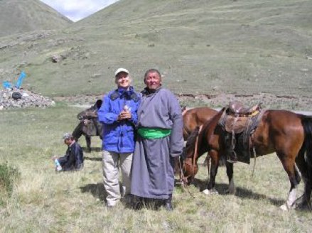 So, after a late night of singing we got up to ride. The Mongolians use a hard wooden saddle with raised parts in the front and back, but they gave us “Russian” saddles that had a bit more padding. We found out that our jeep was going to follow us and were extremely miffed, having expected to carry our gear on pack horses. But I must say, I came to worship that jeep like an oasis in the desert! The weather was totally unpredictable! One minute hot blasting sun and gorgeous blue skies with huge fluffy clouds, then up over the mountain comes a big dark giant and WHAM, you get hail! There we were, alone in the valley (the jeep would go far up ahead and wait), soaked to our bones and freezing!! The horses wouldn’t even move, they just jammed up together with their butts to the wind. Then, ta-da, sun again. It was crazy.