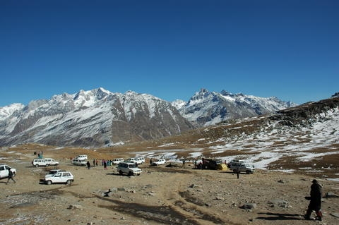 After a few incidents (car stuck in an ice patch, I slipped and almost fell down a crevice etc.), passing a few villages on the way, and a chai break at a village called Marhi, we reached Rohthang Pass in a couple of hours. I got out of the car with my heart beating wildly due to the hair-raising drive I went through- every bit as exhilarating as it was scary.