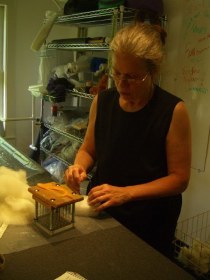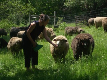 Another basketry artist, Donna Nazarenko of Turbridge, who teaches around the United States, demonstrated various other patterns and styles of baskets from Nantucket and Shaker areas. We were especially taken with her birchbark and pine needle baskets, an almost lost craft now seeking to be saved. Many other basket makers in Vermont have revived the fading art and create beautiful baskets, both collectable and utilitarian. Throughout the eighteenth and nineteenth centuries settlers here had Merino sheep farms, and wool was the main industry. The internationally known Ibex special woolen sport garments are made in Woodstock today. Also a few small flocks are kept for the cottage wool industry. Several local artisans specialize in hand knits and felted items from the local wool, and you can watch sheep shearing in the spring. We visited All’s Wool That Ends Wool where Dianne Kelley Stott, who escaped a New York City executive job in the garment industry to follow her passion here, creates unique special-order products, which range from fulled (felted) garments to teddy bears. Her 48 cross-bred sheep are her pets as well as her friends. She crossed cordel sheep, known for the softness of their wool, with romney sheep, which have shiney wool, to produce soft wool with a sheen that is unavailable commercially. She enjoys all aspects of her craft and explained sheering, washing, picking, carding, dying, spinning, weaving, shrinking, and fulling processes. She specializes in fulled items, which are popularly called felted. “There is something very primal about the fulling process,” which is the oldest fiber process of all. She also invented a special hand processing machine for needle felting dry wool, the “Fabulous Felt-o-Matic.”