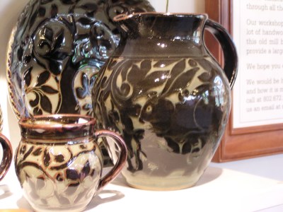Many ceramicists choose to live and work in Vermont. Perhaps one of the most widely acclaimed is Miranda Thomas, whose masterpieces were selected by President Clinton as Gifts of State for a Middle Eastern trip and also as his gift to the Pope during his visit to St. Louis, MO. Some of her exquisite and unique pieces feature animals embossed and delicately gilded or colored in the glazing process. Her distinctive work is easily recognized the world over for her bold yet subtle embellishments and the lovely perfection of shapes, from huge one-of-a-kind display pieces to table setting patterns. She and her husband, Charlie Shakleton, who is famous for his satin-fine hand-built, one-of-a-kind furniture, share