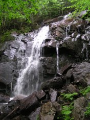 We stopped at St. Zenon at La Glaciere Restaurant in Pourvoirie Trudeau Hotel and got coffee and delicious whole wheat cinnamon buns, freshly made that morning by Linda, the friendly waitress who was fluent in both English and French and told us many places to see in the area. She told us about the Regional Park Sept Chutes just 2 km. farther, so we went there at 4:30 p.m. and found it not yet open for the season. It was late afternoon and pouring rain, but since it is daylight until very late and not really cold, we donned our ponchos and hiked it anyway, and we were so glad we did. It was a lovely, steep walk on a mountain trail through beautiful green dripping evergreens and sugar maples with many spring wildflowers and ferns on the forest floor. The path was wood chips, pine needles, and granite boulders right beside the little river and had seven little waterfalls before we arrived at the really tall one…absolutely beautiful and so peaceful. The rain made it even better…a perfect temperature and kept the mosquitoes and flies away for the most part.