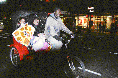 A bicycle taxi, also called a pedi cab, is a three wheeled bicycle, with a large bench seat in the back, for up to three passengers. The driver sits up front, on a normal bicycle saddle, and earns his living, pedaling customers to their destinations. The taxis have been winning recognition as an environmentally friendly alternative to automobiles, which pollute the air and choke passersby. But for New Yorkers, the most important advantage of the bicycle taxi is the speed. During rush hour, when traffic grinds to a standstill, the nimble bicycles can create their own lanes, slipping in between or beside cars, covering the distance in less than half the time. At other times, when traffic is moving well, the big advantage of the bicycle taxi is that you can actually get one. Every New York has had the experience of standing on a street corner, with his arm up in the air to signal a yellow cab, which never comes. At times the entire city seems to be a sea of yellow taxis with only one passenger. But the bicycle taxis are always willing to stop. I spent a day in New York, driving one of the taxis, pedaling around behind my friend Tomer, a young, motivated immigrant, who taught me the ropes of bicycle taxi driving.