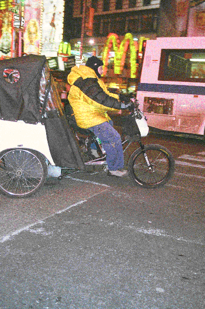 Like all real New Yorkers, I have always had a love affair with my city. I never owned a car in New York, always preferring to ride a bicycle or walk. On a bike, you aren’t driving through the city, you are driving with it. You are tapping into the never-ending heartbeat, driving along with the circulation of blood and money that keeps the city alive. Riding a bicycle in New York, you get to know the city intimately, which is something most tourists will miss out on, if they are always taking taxis. Bicycle taxis, or pedicabs, operate all year long. When it is raining or snowing, they put up the top, just like on a horse drawn coach, to keep the guests dry. “I actually make more in bad weather.” Explained Tomer. “New Yorkers are impatient anyway. But when it is raining or snowing, no one wants to stand on the corner and wait for a bus or a taxi. So, they ride with me.”