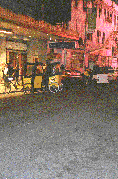 For tourists, riding the bicycle taxi is excellent. During normal traffic conditions, the bicycle taxi moves slower than a car, and it is wide open. So the tourists can get a good look at the city, and make excellent photos. From the back seat of a bicycle taxi, you can cock your head back and stare straight up at the mountainous skyscrapers. You feel as though you are at the bottom of a deep canyon, peering up to the sky. Rush hour lasts till about six thirty or seven, when Tomer shifts his attention to Times Square, where he picks up tourists and takes them sightseeing. Around eight or nine o’clock Tomer takes a break and eats dinner. He goes back to work at ten, when the theaters let out. “After the shows end, it is hard to get a taxi.” Tomer explains. “Besides, after seeing a great show, the people don’t want to go straight home. So they take a ride on the bicycle taxi, and watch the lights of Manhattan.”