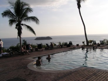 The Anaconda Resturant and bar on the premises has excellent meals and bar service, and your reservations specify whether or not breakfast is included. The hotel is not for handicapped, as there are many steps to the various apartments, which are situated up the hillside amidst lush tropical flowers. The food at Anaconda is delicious, quite reasonable, and freshly made after you order. If you go for an early breakfast or a late afternoon snack, you can watch many monkeys in the trees below the porch restaurant. Almost any time of day or evening in the restaurant you’ll be entertained by the iguana pets that seem to enjoy free runs through the open air reastaurant. On the street in front of the hotel is the bus stop down the steep hill to Manuel Antonio National Park, reputed to be the most prisine coast of Costa Rica. It is also possible to take a very long hike down to the public beach, but the best way is to book a tour at the hotel desk.
