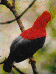 The next morning we got up early to see the Cock-of-the-Rock (Rupicola peruviana) birds perform their mating dance. Each morning as many as several dozen of these parrot-sized birds perform an elaborate mating dance. The vibrant reddish orange males display their crest, showing off and posturing for the females. The females, fewer in number, watch, then choose the most suitable males. When selections have been made the pairs go off together and the rest fly off to look for food.