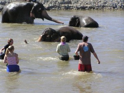 Oh my gosh, indeed I could die right now a fully content woman… OK, only fully if I knew these amazing creatures would never again be abused, tortured or made to serve Man. I cannot even begin to describe this experience but I will humbly try: The Elephant Nature Park (www.elephantnaturefoundation.org) is about forty or so kilometers north of Chiang Mai in the middle of a valley with lush jungle and a river running through it. There are thatched huts for us volunteers (with a mattress on the floor and a mosquito net) and the permanent staff. It is rustic but not really rough. We have electricity, shared toilets, cold running water for showers (you don’t really need a hot one) and the most delicious food I’ve had yet in Thailand. There are twenty eight elephants, forty dogs, and probably twenty or so cats, three cows and maybe thirty people counting permanent staff. The elephants have been rescued by this amazing woman, Dr. Sangduen ‘Lek’ Chailert, the founder of the elephant park who has dedicated her life to saving them and trying to change the cruel practices of “taming” them called the pajang. This is where they take the baby away from its mother and starve and torture it. Lek also discourages people from riding the elephants, which actually elephants are not designed to do as it hurts their backs. And of course trying to get them out of the circuses doing demeaning tricks or begging on the streets. I will let you read about her and the park on your own because the history of both is just too much for me to go into here. What I can say is that this is one of the greatest experiences of my life. We actually feed and bathe the elephants! There we are right in the river with them! My Gosh! I was so blissed out I was nearly hysterical.