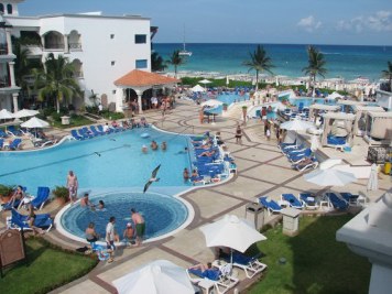 If you want a Mayan inspired spa treatment or wines from their 127 selection wine and champagne list there is an extra charge. Also in the 5 Star categories are his Gran Caribe Real in Cancun and the Gran Porto Real in Playa. After Hurricane Wilma Fernando used part of his next door Grand Caribe Real land to build an all new The Royal in Cancun. The Gran property in Playa is across the street. There is also a 4 Star Real Playa property nearby. I did eat in one restaurant on the Gran Caribe property, which is not part of the all-inclusive and that is called Salute. The first Salute opened in Mexico City 5 years ago and it opened in Cancun in December 2006. You must try their Mango Margarita; the food is also fabuloso. I had a choice of restaurants at the Royal where I could partake of my three meals; Japanese, French-Mexican, coffee shop, poolside restaurant or a 24 hour lounge with a pool table, table tennis, snacks, several TV’s and a selection of drinks. Depending on season, my Royal Junior Suite rack rate would be between $240 and $350 per person, all inclusive. There are all sorts of incentive pricing available.