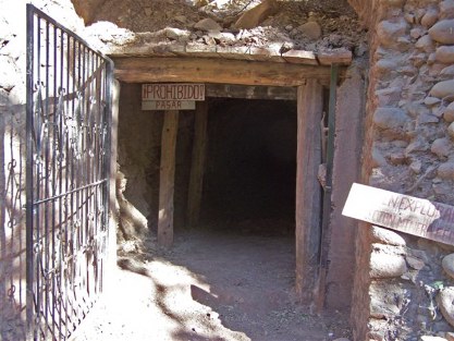One of the goals for my second and extended visit was to explore a silver mine. There are a few mines still operating, but most of them are only reached after a rough climb up the sides of the canyon. The entrances to the closed San Miguel Tunnel and Santo Domingo mine, however, are right on the road going away from the town on the east side of the river. San Miguel was locked, but there was no lock on the Santo Domingo gate. Perhaps, in spite of the warning signs, this is a tacit invitation to see the inside of a real silver mine. Not every guide is willing to take visitors inside the mine, but the man I hired, Roberto, had been here before, so he boldly stepped out of the truck and opened the gate.