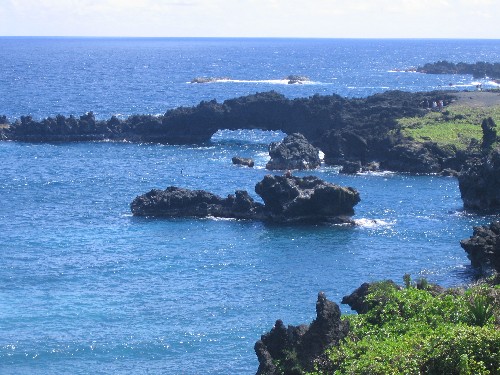 On anyone’s Hana agenda should be a visit to Waianapanapa State Park, 15-minutes north of town. At the park, the power of natural forces is on display. Sculpted from lava by water and wind are jagged cliffs, rainbow arches, spewing blow holes and eerie caves. A path leads to a black sand beach from which we saw a couple of adventurous boys swimming out to an island. After that we went south of town 20-minutes to see the impressive stair-step group of seven waterfalls at Oheo Gulch. Attracting many was the short walk up to Infinity Pool for a refreshing dip before starting back.