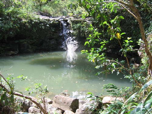Much time is spent taking the pull-outs to the many rushing streams and plunging waterfalls flowing down the mountain sides. After reaching the old town of Hana, day-trippers usually continue on a few miles to Oheo Gulch, commonly called the Seven Sacred Waterfalls.