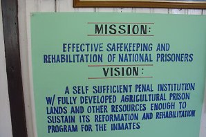 On the wall in administration building was sign which read, “Mission statement: The effective safe keeping and rehabilitation of prisoners. Vision statement: “A self-sustaining penal institution with fully developed agricultural, sustainable rehabilitation.”