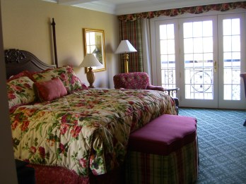 My room in the newer South Building, which went even beyond what I had expected of a Five Star, Five Diamond hotel, is quite large and furnished with period antique furniture and tastefully selected green, crimson and gold appointments…every detail perfect for the comfort and warmth of an exquisite home. The spacious marble bathroom, with its own TV and telephone, features a stone walk-in shower beside a huge tub and marble vanity with double sinks. The granite mini-bar had everything I could wish for. And what fun…like a magic genie the little LCD screen beside my bed did all kind of things to my room! With just a touch I could turn on or off or dim various lights in the room, call for service, control the TV and closing and opening the drapes for the exquisite view from my French door which opens on a protective grillwork railing overlooking the placid lake and mountains beyond.