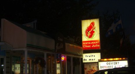 Just as darkness fell, we zoomed back across the water to Harve. Across the street from our motel we went for dinner at Restaurant Chez Julie, the unanimous recommendation of locals. This casual seafood restaurant has been an institution for generations. Janet, a native Acadian, and her Greek husband have owned this place for 30 years, 22 of which they served three meals a day. Now only dinner is served and with an enormous menu of seafood selections, fresh from the waters within sight. Several people we chatted with recommended their favorite: seafood pizza, served in about seven different styles. I was delighted to order that, and even the nine-inch one, loaded with thick cheese and an array of shrimp, crab and scallops, was enough for two people.