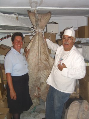 Several members of our group selected the fresh local catch of the day or the fisherman’s sampler of everything! The plates are enormous, and every bite is to die for! Janet herself served us with a big smile and spoke fluet English and French, switching easily from one to the other for each guest’s native language. Before we left she took us to see the amazing 250 pound halibut in her freezer. The year before they had a 400 pound one!