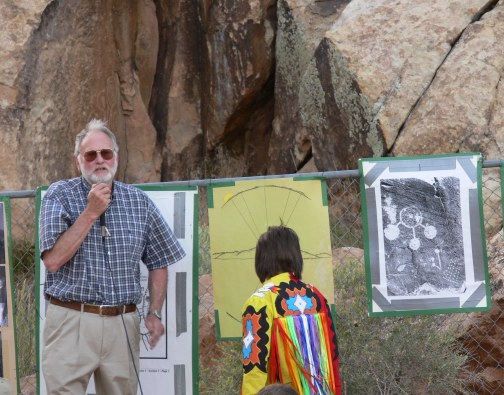 We wished we had arrived hours before sunset in order to study the glyphs more. While watching the setting of the sun and the dances and learning from the talk, we did not have sufficient time before dark to really study the drawings. There are over 90 panels and 1500 figures and markings. This ancient treasure is only protected by a small chain link fence, which Boy Scouts were instrumental in erecting. It is the hopes that the site will soon be more permanently and securely protected as being a “natural Stonehenge.”.