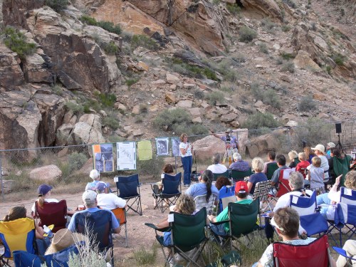 Several scientists who have worked diligently on the project for many years include archeologist V. Garth Norman, director of Archeological Research Consultants and author of the book Parowan Gap Nature’s Perfect Observatory, and Nowell L. Morris of Solarnetics Inc., who wrote The Parowan Gap Archaeoastonomy Report and is a professor at the University of Utah. Dr. Morris was our speaker at the celebration and interpreted the petroglyphs. To order his book click here. There was a young member of the Paiute Tribe who demonstrated tribal dances to honor the area. Walter, the senior member of the local tribe, told about ancient customs. About 500 people brought lawn chairs, blankets, and cameras to participate and appreciate this amazing place.