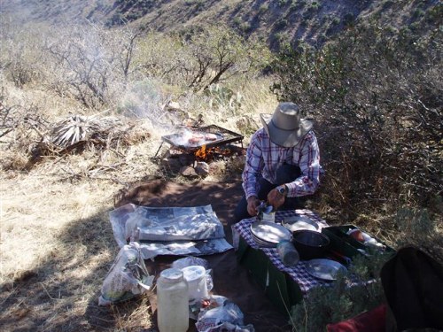 I awoke to the clamor of hooves as the wranglers brought the horses in for the day’s rides. Morning and afternoon two-hour rides range from an easy-going-walk-trot-scenic to hold-onto-your-hat lopes. Undulating trails through rock formations tinctured with lichen stir the imagination. Many of the same cacti I saw south of Tucson are here, and in addition are the Palos Verdes trees, and an abundance of Creosote bush. One afternoon each week is dedicated to team penning, and on Sunday mornings the chuck wagon is rolled out for an authentic cookout on the breakfast ride.