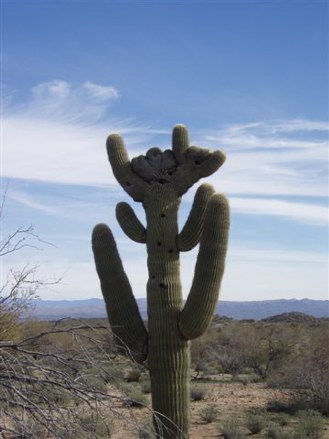 Wrangler Jake took Max and me for a ride on sandy footing across the desert floor. All I had to do was sit back and rock along in an easy lope on my steady steed,Juarez. Jake let us do a little trail-blazing through shimmering Teddy Bear Cholla. It looks cuddly but, like most desert plants, has sharp needles for defense. The Jumping Cholla attaches to anything that comes near…its clinging clumps sticking and spreading if threatened to be pulled apart. The ubiquitous, hardy Prickly Pear grows in mounds that can turn a great day into a bad one in a hurry if you land in one. We maneuvered our horses through the cacti, chasing jacks that sprang in foot-high leaps ahead of us on our path. Other local wildlife includes the mountain lion, mule deer, wild pigs, a seldom-seen gray fox, and an array of colorful birds.