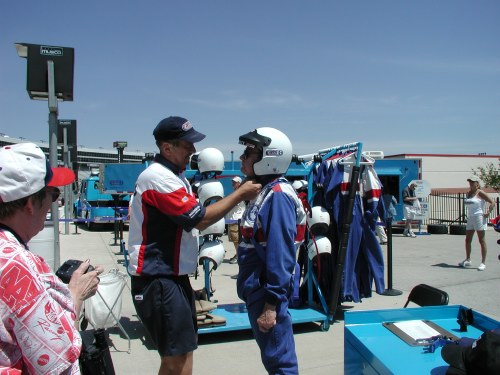 Next we climbed into vans for a ride around the track with an instructor. Stopping at various places on the track he schooled us on the proper way to drive in that particular section. We just hoped we could remember the instructions at the critical times, and our hearts thumped harder. Back at the office we received serious safety instructions and then had to sign our lives away before putting on official racing suits and helmets, constructed for extreme safety and fireproof.