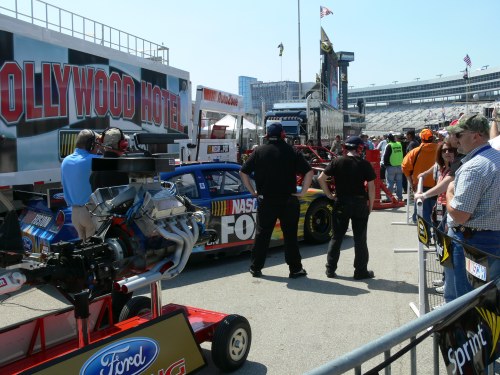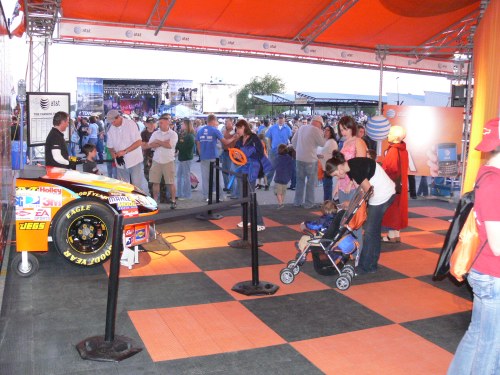 In the vending areas there were many free attractions to keep us busy and excited, some for kids and some for adults. My husband especially enjoyed posing with the skimpily clad young woman dressed in checkered flags! The kids loved talking to Sparky, the NASCAR mascot. And of course, everyone wants autographs. In the general ticket area there are not many opportunities, but sometimes before the race a driver may be featured and make a brief appearance and give some autographs, but that is rare on the actual race day. More often it happens on Time Trial Day or on the Practice Day.