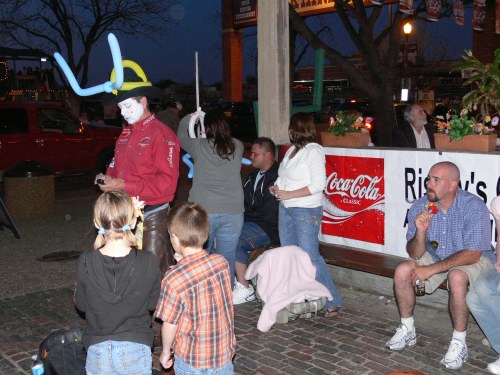 Grandpa had read about the many other attractions in Fort Worth area and surprised us by announcing near the end of the race that we could go to the Stockyards for supper. We left the Track a bit early in order to beat the crowds, but the traffic was well organized by the extra police force, who place cones to guide extra lanes for leaving, and the traffic ran smoothly. We made our way to the site of the historic cattle drives and had great fun going into the various shops in the authentic old saloons. We could not believe the prices of handmade cowboy boots: thousands of dollars, but if was fun to see. One kid with us insisted on riding the electric bull, which nearly bucked him off. The other youngsters and Grandpa had a great time getting lost in the maze, built to resemble old wooden cattle pens for directing cattle to slaughter. We could stand on the platform above the maze and know the way out for them if they got extremely lost. There were many NASCAR booths and displays and a live, outdoor concert.