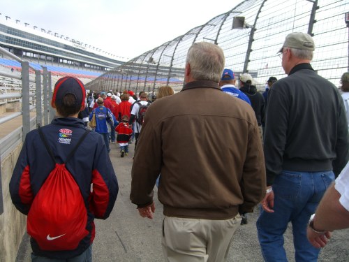 Grandmother had stated, “No need to dress up because it’s Texas and it’s NASCAR… you’ll only need cut-offs and tank tops if it’s hot.” Fortunately, we didn’t go that briefly clad, but jeans and tee shirts were all we saw. We overheard some experienced track fans, who had special passes to go into the Garage and Pit area, say that no bare legs, sleeveless tops, or open-toed shoes are allowed. It is a good thing to remember if we ever get to go to that more expensive area, but the kids have to be over 18 for that also, so for us it will be a long time yet.