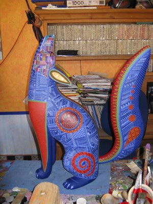 Theories abound regarding the beginning of the modern-day manifestation of the art-form. Some say that because hallucinogenic mushrooms are native to this part of Mexico, drug induced revelations caused the imaginations of some to wander, ultimately becoming expressed in their carvings. The better explanation appears to be that knowledge of colorful, large, papier maché alebrijes or dragon-like forms which originated in the State of Mexico, eventually filtered down to Oaxaca, and were the inspiration for the fathers of contemporary painted wooden carvings. “You know, it’s not accurate to refer to what we create as alebrijes, because to the older generations of Mexicans, and to true folk art collectors, alebrijes were developed near D.F. (Distrito Federal, or Mexico City, the nation’s capital), and what we do is completely different.”
