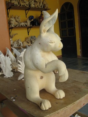 A visit to the Ángeles workshop adjoining their home, accessed by a heavily pot-holed narrow dirt road towards one end of the village, affords an opportunity to learn about this extraordinary skill-set, from Jacobo, Maria — an excellent painter in her own right — and some two dozen other members of their family who produce some of the finest quality wood carvings found anywhere on the continent. The men do most of the carving, while women do most of the painting, but the tasks are definitely not exclusively based on gender lines. Carving is done with non – mechanical hand-tools such as machetes, chisels and knives. The only time a more sophisticated tool is used is when a chain saw is employed to cut off a branch and level a base for the proposed figure.