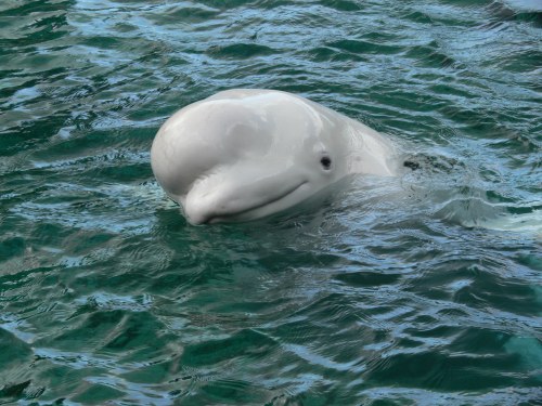 The whale will respond to a hand movement up and down by nodding her head the same ways. The whales seem to have a specific set of sounds which they loudly make at various times during the encounter, and we were sure they were “talking” to the participants. Sometimes, with their adorable “smiles” we were sure they were playfully teasing or with certain squeaks were saying, “thanks.” In response to hand commands the participants were taught to give, the beluga would roll over for her tummy rub or onto her side with her flipper held high. All the while the trainer was adeptly checking the whale for any skin abrasions or other problems. They are also weighed weekly, to be sure they remain healthy. (I wonder if they ever have to go on Weight Watchers!)